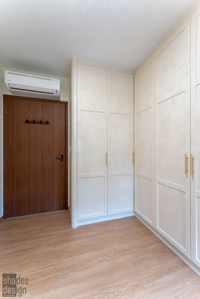 This 4-room BTO HDB at 116A Tengah Plantation Crescent underwent a renovation to create a modern Victorian-inspired home. The design focused on incorporating ample wardrobe space and display storage for the homeowner's extensive clothing and POP MART figurine collection. A dedicated pantry was also included for wine storage. The open kitchen concept features shaker-style cabinets with handles, while wall beading adds a touch of classic elegance. A chandelier in one of the bedrooms further enhances the luxurious and sophisticated ambiance.
